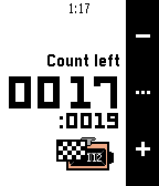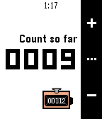 A tally counter with 2 modes: Free Count and Target Count. Main features Key Shortcuts: - Hold UP button to quickly switch between modes. - Hold DOWN button to quickly reset count. - Press SELECT to scroll through available actions. Free Count Mode: - Count from 0 up to 9999. Target Count Mode - Count to target number. - 2 Display modes: Count down from target to 0, Count from 0 up to target. - Vibrate to notify when the target is reached. Target Entry Page - Hold SELECT to quickly confirm the entry. - Hold UP or DOWN to quickly scroll through numbers.