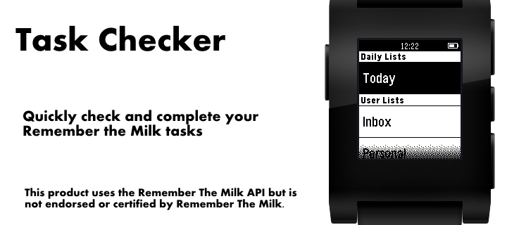 Quickly view, complete or postpone your Remember the Milk tasks from your Pebble. Based on Pebble.JS, so requires an online connection to your phone. This product uses the Remember The Milk API but is not endorsed or certified by Remember The Milk.