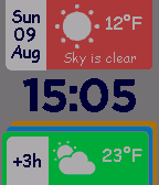 Displays the current weather and weather forecast ( 3 time zone ) . Weather forecast will be switched every 10 minutes ( Or acceleration sensor ). If the Pebble disconnected from your phone that your pebble will vibrate and change the background color.