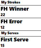 Now track stroke statistics per match! Winners, errors, and serve stats are stored per match. Tracks game, set, and tie break scores in a simple to read format for an entire match up to 5 sets. [Up] increases game score for player 1, [Down] for player 2. [Select] once to update stats [Select] twice to reset current game score [Select] hold for two seconds to reset entire match and stats