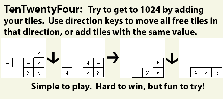 Mini-clone of 2048- super addictive 1024 math puzzle game. Slide matching number tiles together until you get to the elusive 1024!