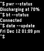A Linux Terminal Watchface that Displays Battery Status and Percentage, Bluetooth Status, and Unix-Formatted Time and Date. Now with prompt animation and a few bug fixes.