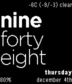 A tweak on the text watch, that includes the weather in the top right, date in the bottom left, and battery percent in the bottom left. Notes: -Weather and battery update once an hour. -Weather requires GPS services on your phone to be turned on. -Weather is displayed in CURRENT (LOW/HIGH) CONDITIONS format in Celsius.