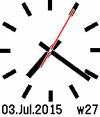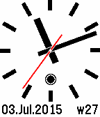 configurable options: - calendar week type (ISO, US, first Monday) - show low battery (thin circle) / charge symbol (filled circle) (yes, no) - limit for low battery (10%, 20%, 30%) - date order and delimiter - second hand color (red, black) description: - minute / hour hand are accurate to the second - white border around each hand - code to keep hands wide constant