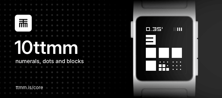 TIC-10TTMM Numerals, dots and blocks Original abstract time display with date, seconds, and battery complications. TIC-10TTMM is a bold evolution of the acclaimed 9TTMM watchface, combining function with visual elegance. Hours are displayed in large numerals, while minutes are shown below using six square blocks of 9 dots — each dot marking a minute, each full square representing ten. It’s an intuitive and engaging way to read time at a glance. Additional features include seconds, date, and a linear battery indicator (each line = 20%), plus a “shake to view” mode for expanded info in large, readable text. A small “X” appears if Bluetooth is disconnected. TIC-10TTMM transforms time into a clean, tactile experience — minimal, meaningful, and award-winning. This premium watch face is available for $4.99 plus local taxes. Enjoy a 1-hour free trial to explore all its features before you buy. Secure and easy payment is processed via KiezelPay. TTMM for Pebble watch faces have won top awards for originality and design, including the Special GOOD DESIGN Award, GOOD DESIGN in New Technologies (2017), Silver and Gold A’ Design Awards, and the FWA Mobile Of The Day — celebrating innovation and excellence. Developed by TTMM sp. z o.o. Design by Albert Salamon Programming by SystemD International LP and Gregoire Sage Copyright © 2025 TTMM sp. z o.o. All rights reserved.