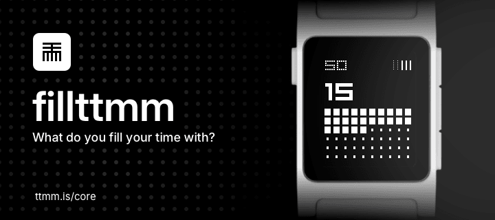 TIC-FILLTTMM What do you fill your time with? An abstract digital watchface with a bold, original time display. Featuring a unique visual style and built-in complications, it keeps you informed with hourly vibrations, Bluetooth alerts, and a clear connection status indicator — all in a striking, modern layout. TIC-FILLTTMM invites reflection — not just on how time passes, but how you use it. This original watchface combines classic hour digits with a graphic, abstract display of minutes. Minutes flow beneath the hours across a six-line grid, each line representing ten minutes — a visual timeline that fills as your day unfolds. The intuitive layout makes it easy to read at a glance, showing you what's past and what lies ahead. Discreet complications appear to the left of the hour, while battery status lines (each equal to 20%) sit on the right. The result is a minimalist yet meaningful composition — your personal map of time. TIC-FILLTTMM isn’t just about telling time. It’s about feeling it. This premium watch face is available for $4.99 plus local taxes. Enjoy a 1-hour free trial to explore all its features before you buy. Secure and easy payment is processed via KiezelPay. TTMM for Pebble watch faces have won top awards for originality and design, including the Special GOOD DESIGN Award, GOOD DESIGN in New Technologies (2017), Silver and Gold A’ Design Awards, and the FWA Mobile Of The Day — celebrating innovation and excellence. Developed by TTMM sp. z o.o. Design by Albert Salamon Programming by SystemD International LP and Gregoire Sage Copyright © 2025 TTMM sp. z o.o. All rights reserved. The TTMM name and logo are registered trademarks of TTMM in the European Union and other jurisdictions. All other trademarks are the property of their respective owners.