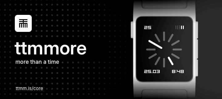 TIC-TTMMORE more than a time TIC-TTMMORE is a minimalist analog watchface that gives you more clarity, more simplicity, and more meaning. The dial is divided into 12 segments for hours, with short and long hands indicating hours and minutes. Time is displayed with 5-minute precision, using a smart rounding system where minutes like 3 and 8 jump forward to the next five, while 2 and 7 lean back — making time easier to read at a glance. Four optional corner complications (time, date, steps, distance, battery) subtly frame the center, offering just enough data without distraction. TIC-TTMMORE invites you to experience time more slowly and meaningfully. This premium watch face is available for $4.99 plus local taxes. Enjoy a 1-hour free trial to explore all its features before you buy. Secure and easy payment is processed via KiezelPay. TTMM for Pebble watch faces have won top awards for originality and design, including the Special GOOD DESIGN Award, GOOD DESIGN in New Technologies (2017), Silver and Gold A’ Design Awards, and the FWA Mobile Of The Day — celebrating innovation and excellence. Developed by TTMM sp. z o.o. Design by Albert Salamon Programming by SystemD International LP and Gregoire Sage Copyright © 2025 TTMM sp. z o.o. All rights reserved.