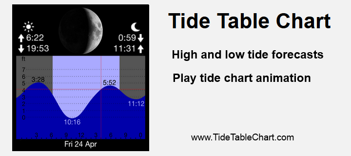 Tide Table Chart provides quick and easy access to high and low tide forecasts. Click Up / Down for high and low tides of the next day. Double click Down to play an animation of moon phase and tide changes for a quick overview. This Pebble app can be used without connection to your phone. But you should run the phone app Tide Table Chart (Android or iPhone) once per week to update the tide data on your watch. DISCLAIMER - Tide data displayed by the app are based on astronomical tide predictions and do not take into account the effects of strong winds, rain, floods and other meteorological events. Do NOT use the app for navigation or any other purpose that may result in personal injury or property damage. Use it at your own risk.