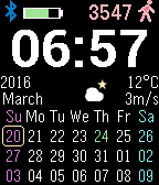 Time&Calendar with Config # 12H/24H style: Depends on pebble # Temperature: °C / °F # Weeks: This-Next-After / Last-This-Next # First day of the week: Sunday / Monday # Holidays: None / JPN / USA / RUS # Calendar: A.D. / JPN # Colored days: 10 Days 4 Colors (You can make it) # BlueTooth: Disconnect Alert # Weather, Temperature ,Windspeed (OpenWeatherMap)