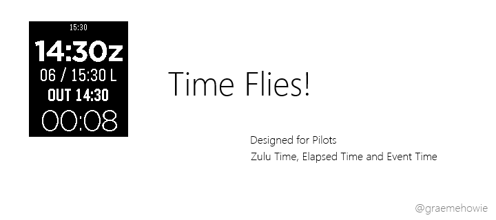 A timer app for pilots that displays Zulu time, a single button reset Elapsed timer, and memory function for "Out, Off, On, In" times. Full instructions are available here: http://goo.gl/jXeqe3 Zulu time is set manually by offset from the watch time. Hold the middle button for five seconds to change Zulu time, up and down buttons to change and middle button again to store.