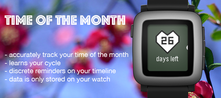 This app allows you to accurately track your period. Simply enter the begin and end on the watch. The app learns your cycle (after one completed cycle) and will remind you 3 days and 1 day in advance via the Timeline. - NEW: Information about your next period is now directly shown in the launcher. All your data is only stored on the watch itself and not sent to some server! If you don't like the heart symbol, simply press up or down while on the main screen. If you like the app, give it a heart in the app store!