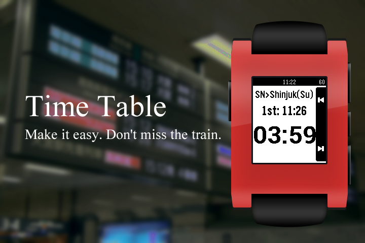 Do you want to know the time of next train easily? This watchapp make it ! And it also shows countdown timer to departure. The demo movie is as follows. http://www.youtube.com/watch?v=ff90cKxljyc