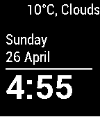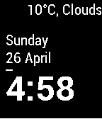 Time is a simple, modern watch face based on the Simplicity watch face. Features include: - Current weather (updated every 30 minutes). Please see my other watch faces for a Fahrenheit version. - Day of the week. - Date and Month of the year. - A Seconds line which grows each second and wraps round at 60. It indicates how many seconds you are into each minute. E.g. if its half way filled, you're 30 seconds into the minute. - Time (12h or 24h). - A battery indicator at the bottom of the screen similar to that of the seconds line. A half filled bar represents 50% battery. I hope you enjoy the watch face. If you have any comments/suggestions, feel free to email me: [email protected]