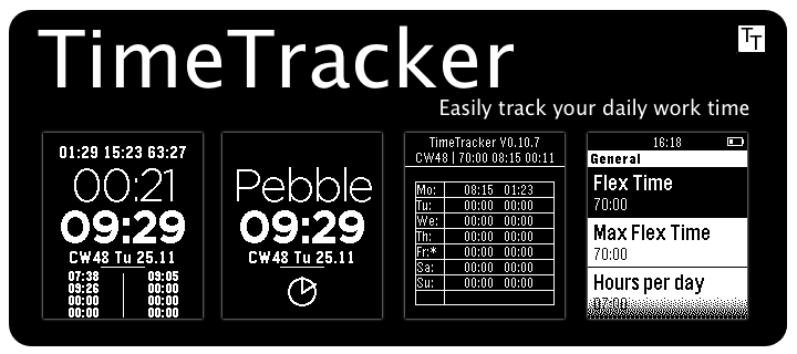 he unlock code is 13321 where the right buttons are 1,2,3 from up to down. With TimeTracker (TT) you are able to clock your daily work time including your flex time account and time rules. TT provides an easy to use interface with the possibility to set 16 clocks per day. At the end of each day you can do an "end of day" to save the clocks into a weekly overview and to save the new flex time value. Work times will be saved for the current week and will be reseted at the first "end of day" in the new week. Features: - "en" language - Clock up to 16 times per day - Display current work time / day end time / flex time - Display break time - Indicates a connected / disconnected BT connection - Hide mode for more privacy - TimeTable for the last week / current flex time / lost time - Display "last time charged" in the time table - Inverts and vibrates when loosing time because of the time rules For detailed information review the documentation at: http://www.albmail.de/Pebble/TimeTracker/TimeTracker.pdf (Thanks Jo) If you like the watch face please donate: [email protected]