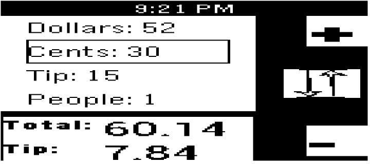 Enter restaurant tip bill info into the watch, using the select button to toggle between "dollars", "cents", "tip %", and "people". The incrementer (up button) goes up by 5 every time you press it, and down by 1, so you can get to your bill price quickly