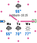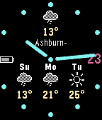 It's a time and weather watchface with analog design. At the top of the watchface it shows the current temperature and condition. Below it displays a 3 days forecast of the max. temperatures and conditions. With a shake of your wrist the forecast of today and tomorrow is shown in detail: Morning, noon, and afternoon conditions. Weather info by Yahoo and openweathermap, updates every 30 minutes. Settings: - Choose dark or light color scheme - Weather display can be switched off - Units C or F - Show watchface circle