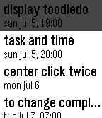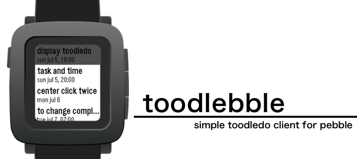 "toodlebble" is the first simple toodledo client app for pebble. it can display set "duedate" or "duetime" and uncompleted tasks. select task and press center button for call actionbar, and press canter button again to "completed" (up/down button to cancel). also set "repeat" task will reschedule automatically.