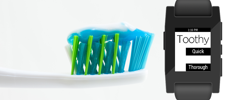 A toothbrush timer. We can't all waste $150 on an electric toothbrush, but we can get one of the primary benefits of an electric toothbrush with a tiny little Pebble app. Time your toothbrushing with too easy modes to get on your way towards cleaner, whiter teeth.