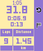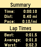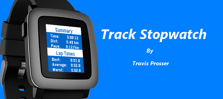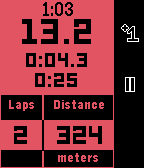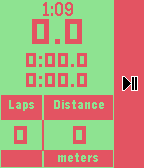 This stopwatch is intended for use when running, cycling, or swimming laps of a fixed distance. Useful information is displayed on the main screen such as: - Clock - Total elapsed time - Current lap time - Previous lap time - Distance Completing the run with a long press of the middle button shows a summary page with useful stats about the workout, including: - Total time - Total distance - Average pace - Best, average, and worst lap times The app supports background timing, so it does not have to be left in the foreground to continue timing a workout. Unit choice and lap distance can be selected on the phone.