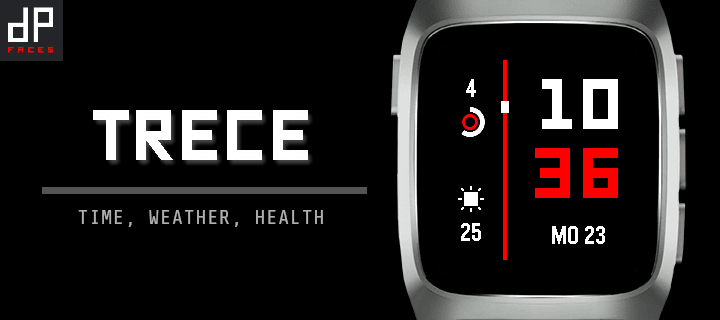Trece means thirteen. - Time, Date - Plain or shadowed time digits - Thousands of steps, and progress of current thousand step count - Weather condition, weather temperature - Battery charge status - Bluetooth disconnected indicator - Vibration on disconnect/reconnect (optional) - Hourly vibration (optional) - Theme colors: 35 presets (2 for b/w watches) - Night theme: automatically uses a different theme at night - Customize all colors Paid watchface for $2. Designed and developed by dP-faces https://dp-faces.com/ --- Get the Premium Pack for a great price — it includes all current paid watch faces and any future ones I release. Thanks so much for your support! ❤️ https://bit.ly/dp-pebble