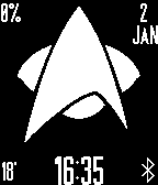 A watchface with a simple star trek logo. Has Pebble battery information and simple date, Bluetooth connection and weather.