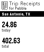 Never go over your trip budget again! Trip Receipts for Pebble is the perfect companion for Trip Receipts for iOS. Trip Receipts displays your daily and total trip expense at the flick of your wrist! Localized in English, Deutsch, & Español.