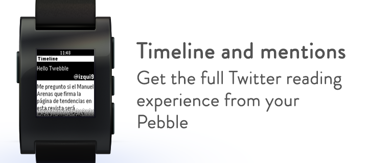 Twebble is the first full-featured Twitter client for the Pebble. It works with SDK 2.0 and provides a unique way to check Twitter from your wrist. You can check your timeline, mentions and even your profile from the app. You can also take action by facing or retweeting tweets.