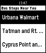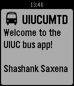 This app will get the 6 nearest bus stops near you and tell you when the bus is coming at each stop. Please email issues/bugs to me! I am always looking to improve the app. Added loading screens (v1.4) Improved algorithm by a bit to speed up loading data (v1.3) Fixed some location errors (v1.2) Updated to improve on getting location (v1.1) Initial release of the CUMTD bus app (v1.0)