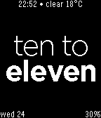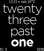 ★New Name New Feature★Tell times in plain English in many ways★ Like it? Heart it! features: - tells time in plain English multiple ways: + fuzzy (ex. 12:44 = quarter to one) + human (ex. 12:44 = sixteen to one) + machine (ex. 12:44 = twelve forty four) - (optional) alignment - shake to show detailed time, date, battery & (optional) current weather condition (with temperature in C or F) - midday & midnight time - monitor bluetooth connectivity with phone (vibrates & invert)