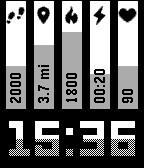 Unique watchface design, showing - day of the week - month - date - year - battery percentage in vertical columns, plus time in large digits. Progress bars show time advancements, and battery discharge. Tap on the watch to see health metrics* - step count - distance walked - calories burned - time active - heart rate Each metric shows progress toward the goal (except heart rate, which is percentage of 250, don't try to reach it) which is average of your achievements from prior days. Large white time also show time progress thru the day as they're gradually filled with gray. Configurable options include - Whether to show time progress by filling numbers with gray - Timeout to automatically return to main screen from health screen *not applicable to original Pebble, and Pebble Steel.