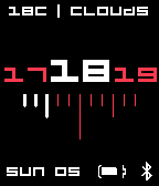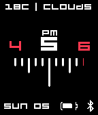 Simple watch face based on LIMITTMM by Albert Salamon. This version in black include weather, date, bluetooth battery status. Larger centre number is the current hour. As explained in LIMITTMM, each line represents a five minute period. Medium sized line represents quarter. Long line stands for half hour. More colour options and added settings coming soon. Version 1.1 include option to use Fahrenheit. Version 1.2 include new white theme. Version 1.3 new settings screen, better persistence.