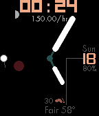 Analog watchface with; -Pebble Health step counter -voice control for a NEW countdown timer, chronograph, calendar and weather forecast. Tilt the watch toward your face until you see a microphone on the left side of the screen (~45 deg toward you). Hold for 2 seconds to enter the dictation UI. NEW Say an amount of seconds, minutes and hours and "timer" to set a countdown timer. For example "one hour, five minute, 30 second timer". Say "forecast" for the 4 day forecast, "calendar" for a calendar, "start", "stop", "reset" to control the chronograph or "steps" to send the previous days step count to the timeline (in case it did not automatically send after midnight). Drop your hand to your side to exit dictation UI, forecast or calendar. -Optional second indicator. Say "second" to enable/disable. -a 24 hour indicator (red circle) -moon phase in the upper left -current temp/weather conditions -day/date -battery percentage