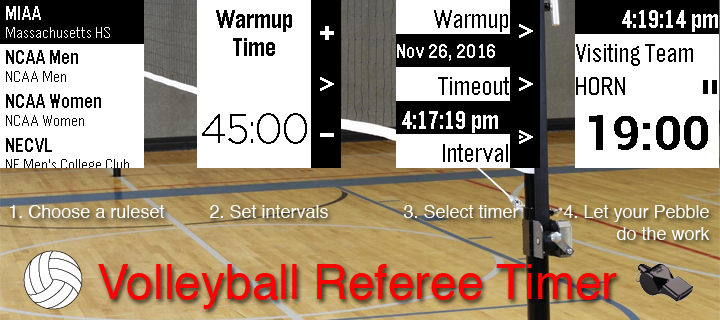 Volleyball Referee Timer for Pebble Smartwatch aids volleyball referees in timing 3 things: warmups, timeouts, and the interval between sets. Since different rulesets use variations of these, it lets you choose the ruleset and lets you customize your timers for matches that you are refereeing. To ensure you never miss anything important, it will vibrate to alert you to upcoming actions.