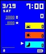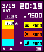 Watch face for easy walkers! You can show current step count with stacked bar chart. * features of steps - display current steps - display stacked bar chart of steps of while morning(0:00-10:00), daytime(10:00-17:00), night(17:00-24:00) - you can set two target , normal level and high level - you can select average steps instead of normal level target - you can know if achieve target with STAR - you can enable vibe at achieve target * general features - you can select color theme - you can select time time 12H or 24H - you can select date format Mon/day or Day/Mon - display bluetooth connection status - you can enable vibe on disconnect - display battery level status - you can enable vibe hourly - you can select ahead of time for vibe hourly - you can select start and end hour of vibe hourly - pop up message window on vibe at hourly, disconnect, achieve target