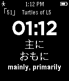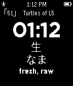 NOTE: Must install this Japanese language pack to work! Japanese is not natively supported by Pebble. http://wh.to/pebble/index_jp.html WaniKani on your Pebble watch! Immerse yourself not only with the time, but your most difficult words. This app takes a snapshot of your WaniKani profile every hour to provide you with the most to date vocabulary throughout your . Currently grabs any words under 70% [correct] rating. If your difficult words aren't for you, you can also change it to display recent unlocks or no words at all. Due to popular demand, activity mode is now available; showing only your due queue on WaniKani. See the last snapshot for example. Tells the time, Shows your title & Level Shows Kanji, Hiragana and the definition Informs you of your current review count available Updates hourly & changes words upon every change to the screen. Runs on Javascript Notes: If you like the Japanese language pack, show your support to the developer. He performed much more work than I did and without his effort, this watch-face would not have come to fruition. The javascript which this is written in runs on your phone. The delay function only works if the app is in the foreground for the entire hour. Working on finding a better solution. For the time being, toggling away and back to the watch-face will update it manually.