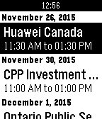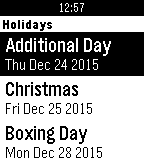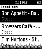 WatApp uses the University of Waterloo Open Data API to display information on your wrist. It includes the following; ~ Weather - Displays the University weather forecast for the day. ~ Food Services Locations - Displays food services locations including a description, building location, notes, and hours of operation. ~ Food Services Menu - Displays the weekly menu (lunch and dinner) for food service outlets ~ Coop Infosessions - Displays employer infosessions for the current term ~ Holidays - Displays upcoming University holidays ~ Parking availability - Displays the number of available spots in parking lots
