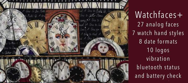 Over a dozen readable color palettes! 27 watch faces, battery & BT vibrate! Up/down switches to the next watch face. Change color with Long Select, then Up/Down. Long Up for battery %. All configurations done by pressing the Select button repeatedly till you see the feature you want to change. Then press up or down to change watch hands, watch logo, date formats, and vibrate mode. Like this app? Prove it! Please give it a heart! Most backgrounds designed by Lukasz Zalewski. Check out my other apps for digital watchface swapping: 6 Watchfaces and 7 Watchfaces. My transit Apps: My Bus, MY SF Bay Bus & Rail, My MTA Bus, My WMATA Bus & Rail, My Vancouver Bus. And other apps: Food Trucks, SF Food Trucks and Any Time.