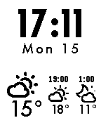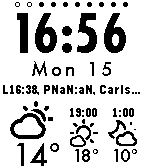 Another weather watchface with weather forecast. Edited watchface Weather My Way - INVERTED. Location services on your phone must be enabled and always on because location is automatically determined. Battery status 1 full dot = 10% of battery. For hourly forecast needed free API code, that can be generated on site http://www.wunderground.com/weather/api/ Weather by Yahoo! or Open weather. Celsius or Fahrenheit in settings. Weather update every 20 min. Last time update of weather and location is available when Debug Mode in settings is turned ON.