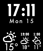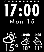 Another weather watchface with weather forecast. Edited watchface Weather My Way. Location services on your phone must be enabled and always on because location is automatically determined. Battery status 1 full dot = 10% of battery. For hourly forecast needed free API code, that can be generated on site http://www.wunderground.com/weather/api/ Weather by Yahoo! or Open weather. Celsius or Fahrenheit in settings. Weather update every 20 min. Last time update of weather and location is available when Debug Mode in settings is turned ON.