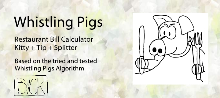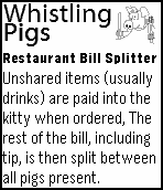 Restaurant bill calculator. Unshared items (usually drinks) are paid into the kitty when ordered, The rest of the bill, including tip, is then split between all present.