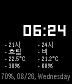 개인적인 목적으로 만들었지만, 혹시나 필요한 분 있을까 싶어서 올립니다. - 배터리, 날씨, 요일 확인 가능한 시인성 좋은 시계 - 기상청의 동네예보 표출 동네예보는 시계를 흔들면 나왔다 사라집니다. 동네예보는 GPS 위치를 기준으로 갱신합니다.(시간, 온도, 상태, 강수확률 을 표출합니다) 즉, 한국이 아니면 이 워치페이스는 사용 못합니다. 동네예보는 초기 부팅시, 매시 0분/30분 업데이트 됩니다. korea only