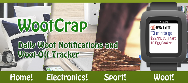 Are you tired of missing out on Bags of Crap? With WootCrap, your house will soon be filled with cheap crap! During one of Woot’s famous Woot-Offs, just leave this app open on your Pebble and it will track the status of the current item, with vibrations to notify you when the item is almost sold out, is sold out, and when there’s a new item. To help you collect as much crap as possible, when a wild Bag of Crap appears, the Pebble will vibrate urgently so you don’t miss out. When you have WootCrap open and a Woot-Off is happening, the app constantly fetches updates from Woot.com to show you the current item up for sale as well as that item’s price, percent remaining, and estimated time remaining. It intelligently decides how often it should be checking the Woot site based on how much of the sale is remaining to help save their servers and save your battery life. Even when it’s not a Woot-Off day, you can use the app to see the current Woot. The watch’s up and down buttons can be used to cycle through the different Woot categories. You have the option of setting a daily notification time in the app’s settings, so that every day you can know what is the new item for sale on Woot. Additional Woot-Off Features: - Vibrates when there are 5% or less of the current item remaining, so if you’re trying to find a Bag of Crap, you have time to prepare for the next item by refreshing your login - Vibrates again when an item is sold out, and when a new item is up for sale Note: This app is not affiliated with Woot Inc.
