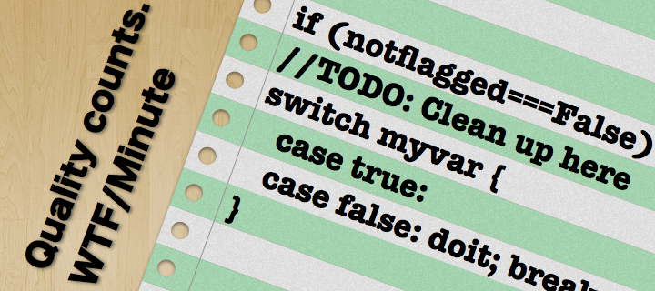 There is only one metric for code quality. WTF per minute. Start the timer, read the code, press the counter button on every curse you yell. The app calculates the WTF/Minute for you. The lesser the number, the better the code. Let's hope for 0 WTF/Minute.