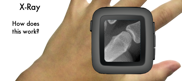 Place your Pebble above your left hand and start the x-ray scan. If you move your hand as you tilt your Pebble watch, it will appear as if you are viewing an x-ray. The up button starts the calibration or pauses the x-ray scan. The middle button shows the custom settings. Use the bottom button to exit the x-ray scan and return to the home screen. Custom settings include keeping backlight on and whether or not you find a fracture in your finger!