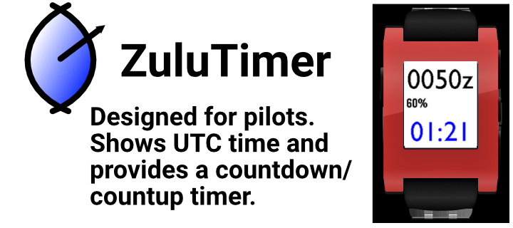 Designed for pilots, the ZuluTimer provides UTC time (aka Zulu time) along with a countdown/countup timer. In countdown mode the timer vibrates in the last few seconds before zero, then starts counting up. On Pebble Time watches the color of the timer reflects down/up mode. Colors are configurable via the Pebble app. The countdown preset is adjusted by using the up and down buttons while the timer is stopped. Pressing the select button starts and stops the timer. Long press on the up button at any time reloads the preset time and starts counting down. Long press on the down button sets the timer to zero and starts counting up. If you navigate away, the app will continue to count in the background and will re-open and vibrate when the timer is about to expire.